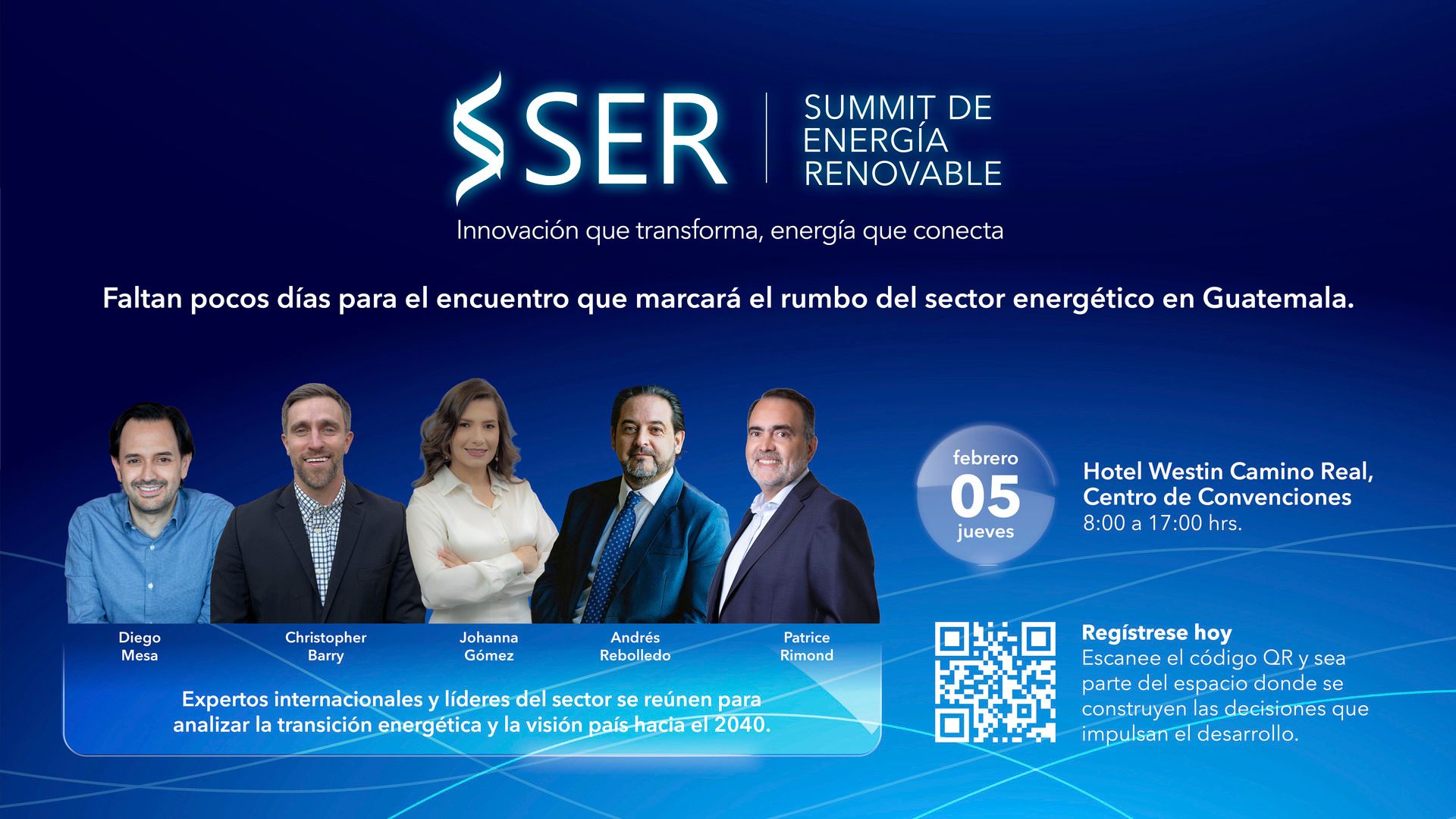 AGER convoca al Summit de Energía Renovable 2026, bajo el lema “Guatemala al 2040. Innovación, Transición, Generación, Demanda y Competitividad”, se llevará a cabo el 5 de febrero de 2026 en el Centro de Convenciones del Hotel Westin Camino Real, a partir de las 8:00 horas.