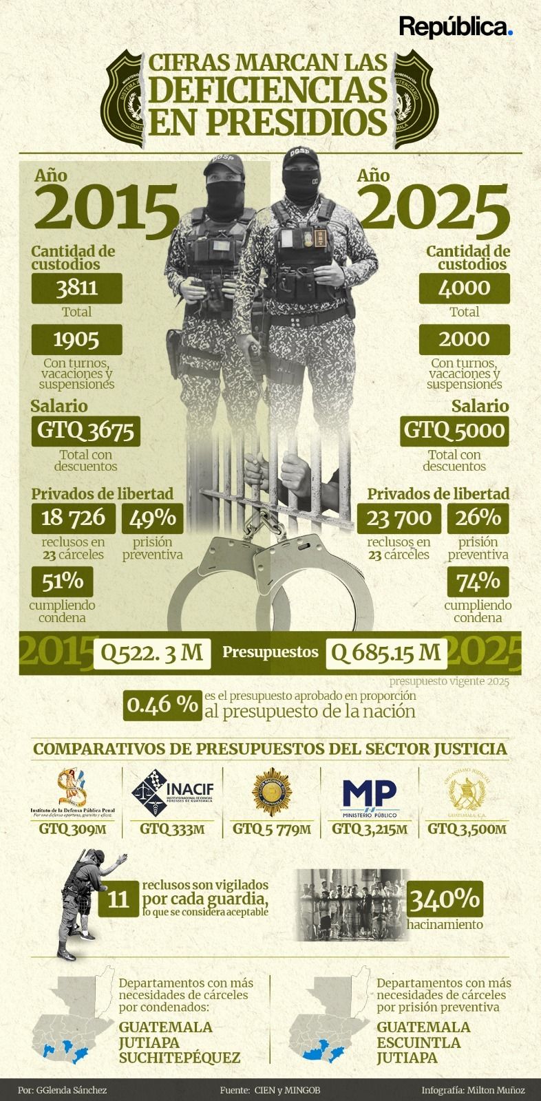Datos clave. Las cifras confirman un problema estructural. Guatemala encarcela poco, pero hacina mucho. El sistema no colapsa por exceso de presos, sino por falta de infraestructura y personal preparado. Esto se enmarca en la carencia de políticas públicas a lo largo de los años.