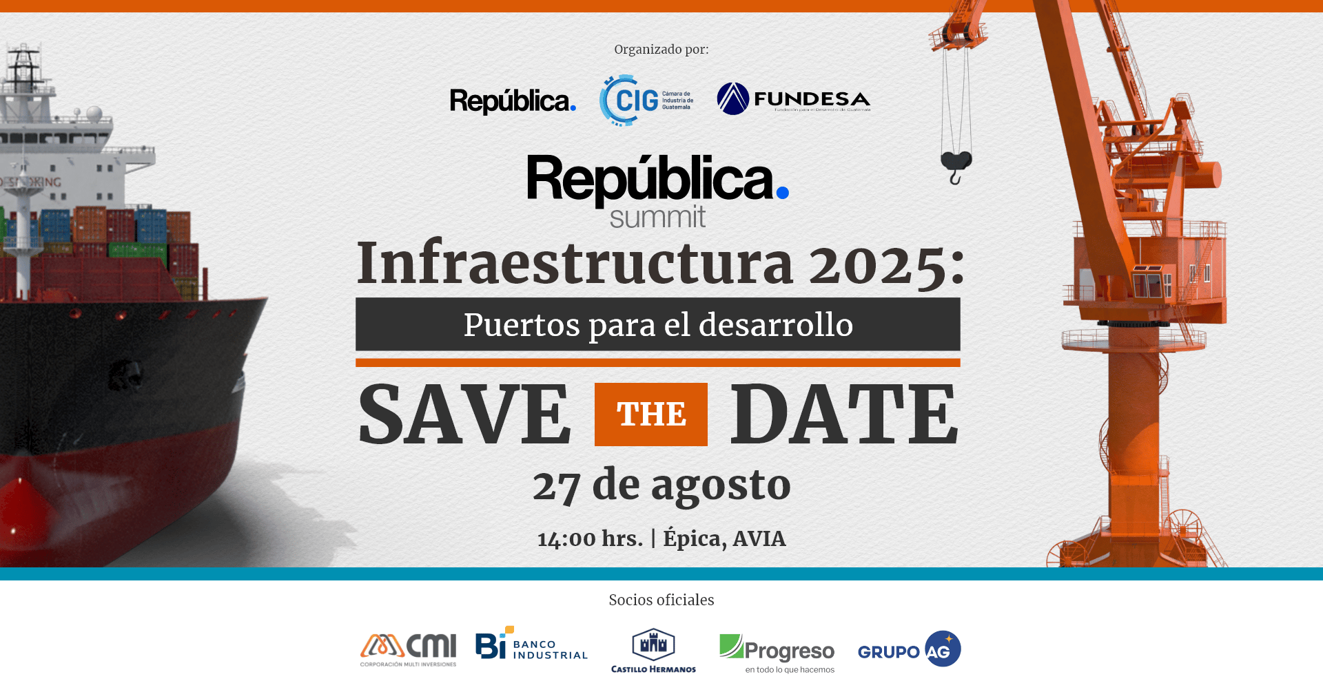 Por ello, le invitamos a ser parte del República Summit Infraestructura 2025, un espacio estratégico de diálogo, análisis y visión para impulsar la transformación del sistema portuario guatemalteco.