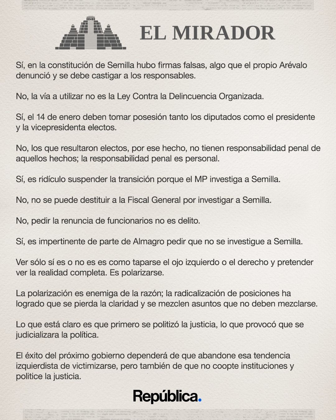 El 19 de septiembre del 2023, publicamos en nuestras redes sociales este El Mirador. Como desde la noche del 25 de junio, durante todo el proceso electoral y, por supuesto, después de los resultados finales, República ha defendido la Constitución, la institucionalidad y la voluntad popular, independientemente de los resultados, con los que se puede estar de acuerdo o no.